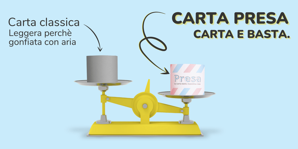 CARTA PRESA, invece con il suo peso di 300gr, riduce questo numero, ad una media di 13 rotoli di consumo annuo per persona!